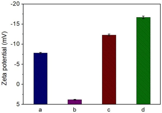 In order to develop a spectrometric aptasensing system, the 4-NP-loaded MMSN with cDNA and aptamer must be successfully synthesized during preparation. First, we used microelectrophoresis (Microelectrophoresis Apparatus Mk II, Rank Brothers Ltd., Cambridge, UK) to investigate the zeta potentials of nanocontainers after each step (Figure 2). The as-purchased magnetic beads displayed a negative surface potential (column ‘a’) since silica nanoparticles have a high proportion of surface silanol groups in aqueous solution. In contrast, the aminated magnetic mesoporous silica showed a positive surface potential (column ‘b’) due to the presence of amino groups. When the carboxylated cDNA molecules were covalently conjugated with the aminated MMSNs, the surface potential became negative (column ‘c’), which mainly derived from negatively charged oligonucleotides. Moreover, the surface potential became more negative when CEA-specific aptamers hybridized with cDNA-functionalized MMSNs (column ‘d’). These results give a preliminary indication that cDNA and aptamers can be conjugated with the carboxylated magnetic mesoporous silica nanocontainers.
