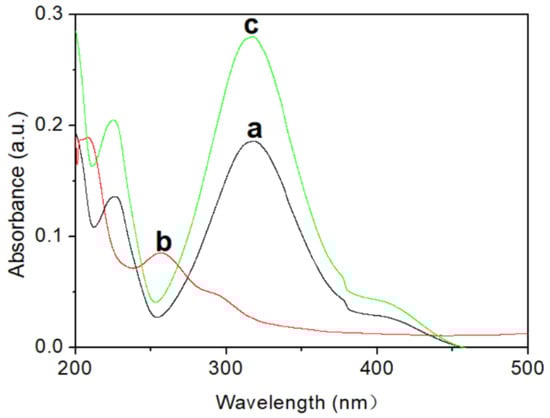 To monitor the feasibility of the aptasensing platform, the 4-NP-encapsulated aptamer/cDNA/MMSNs were used for the detection of the target CEA (1.0 ng mL−1 used as an example). The supernatant obtained after magnetic separation in every experiment was determined using UV–vis absorption spectrometry (Figure 3). Curve ‘a’ represents the UV–vis spectrum of pure 4-nitrophenol alone. In contrast, only one characteristic peak was observed at ~260 nm for the 4-NP-encapsulated aptamer/cDNA/MMSNs (curve ‘b’). This peak originated from the conjugated c-DNA and aptamer, whereas no characteristic absorption peak at 318 nm for 4-nitrophenol appeared. These results further reveal that 4-nitrophenol molecules could be firmly gated in the pores using the formed omega double-stranded DNA between the cDNA and the aptamer. Upon addition of 1.0 ng mL−1 of CEA to PBS (10 mM, pH 7.4) containing 4-NP-encapsulated aptamer/cDNA/MMSNs, significantly, an obvious characteristic absorption peak at 318 nm was acquired in the supernatant (curve ‘c’) which stemmed from the 4-nitrophenol molecules released from the pores. Therefore, the as-prepared 4-NP-encapsulated aptamer/cDNA/MMSNs could be applied, in a preliminary sense, for the detection of the target CEA on the basis of a target-induced controlled-release system.
