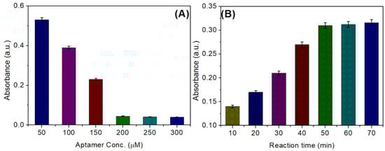 Effects of (A) aptamer concentration in the preparation of magnetic aptasensor and (B) reaction time between aptamer and target CEA on the spectrometric absorbance of aptasensor. (Note that each data point represents the average value obtained from three measurements. The error bars represent the 95% confidence interval of the mean for y-axis concentrations).