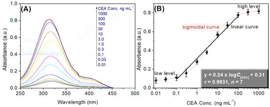 (A) UV–vis absorption spectra of the obtained supernatants after the aptasensing platform reacted with CEA standards of different concentrations; (B) the corresponding calibration plots. (Note that each data point represents the average value obtained from three measurements. The error bars represent the 95% confidence interval of the mean for y-axis concentrations).