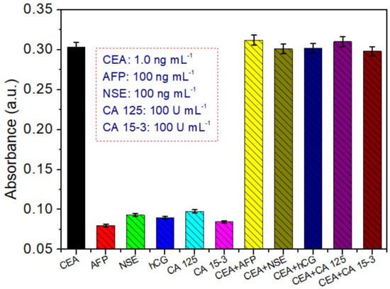 The specificity of the spectrometric aptasensor was studied using our method to monitor other possible biomarkers, e.g., alpha-fetoprotein (AFP), neuron-specific enolase (NSE), human chorionic gonadotropin (hCG), cancer antigen 125 (CA 125), and CA 15-3. In this case, the absorbance at a low concentration of the target CEA (0.1 ng mL−1) was compared with the absorbance at a high concentration of non-target biomarkers (100 ng mL−1 or U mL−1). As indicated in Figure 6, the absorbances for non-target biomarkers, including AFP, NSE, hCG, CA 125, and CA 15-3, were close to zero. In contrast, strong absorbances could be observed in the presence of the target CEA. In addition, a mixture of non-target biomarkers with the target CEA did not cause a significant change in the absorbance relative to the analyte alone. These results reveal that our system has good specificity and selectivity towards the target CEA.