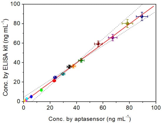 In this study, we collected 15 real human serum samples containing the target CEA from Fujian Tumor Hospital (Fuzhou, China). Referring to the rules of the local ethics committee, informed consent was obtained from all patients who provided specimens. These samples were initially determined using our developed spectrometric aptasensor and a commercial human CEA ELISA kit (for reference). The obtained results are shown in Figure 7. Comparison of the experimental results obtained with these two methods was performed via a least-squares regression method. The regression line was fitted to y = (1.0014 ± 0.0142)x + (−0.2797 ± 0.6209) (R2 = 0.9986, n = 15), where x stands for CEA concentrations estimated with the spectrometric aptasensor and y stands for those estimated with the reference procedure. The standard deviations of the slope and intercept were given in the regression equation. The correlation between the two methods was monitored using t-tests for comparison of the experimental values of the intercept and slope to the ideal situation of zero intercept and a slope of 1. Therefore, no significant differences were encountered at the 0.05 significance level, revealing a good agreement between the two methods.
