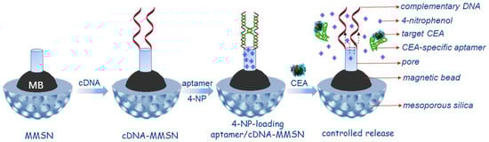 In contrast, aptamers are synthetic oligonucleotides selected from a random nucleotide library using the Systematic Evolution of Ligands by Exponential enrichment (SELEX) method [22]. They show extraordinary analyte binding efficiency that is comparable to that of antigen–antibody reactions [23,24]. In addition, most aptamers are more stable towards oxidation and hydrolysis than antibodies and can be easily modified by the manipulation of terminal functional groups [25]. Li et al. developed a zeolitic imidazolate framework-8 (ZIF-8)-assisted NaYF4:Yb,Tm≅ZnO converter with an exonuclease III-powered DNA walker for a near-infrared light-responsive aptasensor for CEA [26]. Inspiringly, bionanotechnology can provide a new horizon for the development of analytical methods [27]. Qiu et al. designed a bioresponsive release system for the visual fluorescence detection of carcinoembryonic antigen from mesoporous silica nanocontainers mediated by optical color on quantum dot enzyme-impregnated paper [28]. In this regard, mesoporous silica nanoparticles can be utilized as nanocontainers for the loading of indicators or tracers using the corresponding aptamers as the gate. 4-Nitrophenol (4-NP, used as a tracer) can exhibit good spectroscopic characteristics during measurement.