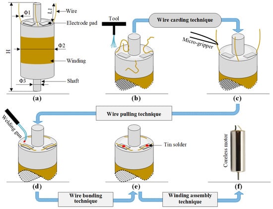 Coreless motor’s winding and its assembly process: (a) The winding of the coreless motor. (b) Electrode wires with random shape and attitude (S&A). (c) Electrode wires are carded to the target S&A through an automated wire carding technique. (d) Electrode wires are dragged and placed on the pads through an automated wire pulling technique. (e) Electrode wires are soldered through an automated wire bonding technique. (f) The final coreless motor is assembled through an automated winding assembly technique.