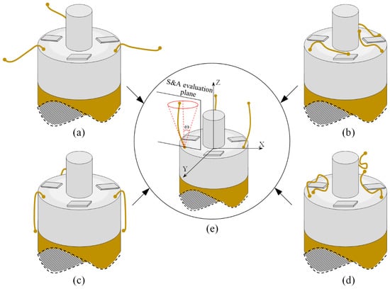 The S&A of electrode wires: (a) The attitude of the wires suspended on the outside of the coil. (b) The attitude of the wires attached or suspended on the pad surface. (c) The attitude of the wires attached to the periphery of the coil sidewall. (d) The shape of the wires with random curl. (e) The ideal brushing result of wire S&A.