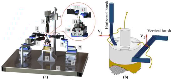 Setup of automated wires in the S&A brushing micro-manipulation system: (a) The automated system of wires used in S&A brushing micro-manipulation. (b) Flexible brush mechanism, with the following characteristics: 1—vision system A, 2—adjustment mechanism with four degrees of freedom, 3—vision system B, 4—support base, 5—rotating stage, 6—optical platform, 7—slide cylinder A, 8—vertical lifting platform, 9—slide cylinder B, 10—finger cylinder, 11—welding clamp, 12—vertical brushing micro-manipulator, 13—horizontal brushing micro-manipulator.