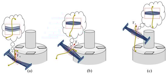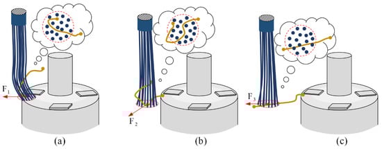 In terms of the vertical carding process, Figure 5a shows the state of the wire with the initial attitude just in contact with the vertical brushing micro-manipulator. The brush contacts the winding sidewall and produces some minor deformation. Under the driving action, the micro-manipulator moves upwards, and its flexible operating end makes local elastic contact with the wire, applying carding force F4 vertically upward along the side wall of the winding. If the carding force is greater than the friction f between the winding surface and the wire, i.e., F1 > f, the electrode wire will change its original S&A under the guidance of the brushing micro-manipulator. Figure 5b shows that when the vertical brushing micro-manipulator is released from the side wall surface of the winding and reaches the top of the winding, a small displacement is generated by the recovery of the brush and an inclined carding force F5 is applied to the wire. Figure 5c shows the vertical upward carding force F6 generated by the micro-manipulator moving up the winding top after a small displacement. The carding force of the vertical brushing micro-manipulator is analyzed in three conditions with reference to horizontal carding.