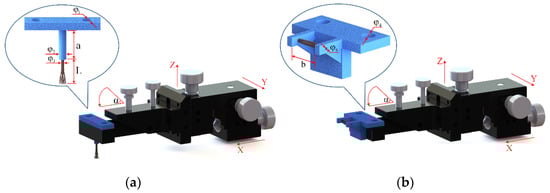 The basic structure of the proposed brushing micro-manipulator is shown in Figure 6. It consists of a horizontal brushing micro-manipulator and a vertical brushing micro-manipulator. Their structure is shown in Figure 6a,b. In Figure 6a, the horizontal brushing micro-manipulator consists of a position–attitude adjustment mechanism with four degrees of freedom and a brusher. The position–attitude adjusting mechanism uses three degrees of translation and one degree of rotation, a combination of three dovetail guide rail translation modules and a yaw device to adjust the position and pitch angle of the micro-manipulator within a small range. The brusher consists of a base and flexible brush unit. Several brush units are glued together and placed into a thin tube of the base, with one end fixed and the other free floating. In Figure 6b, the vertical brushing micro-manipulator also consists of a position–attitude adjustment mechanism with four degrees of freedom and a brusher. Unlike the horizontal brusher, however, the vertical brusher is fixed at both ends to provide a more stable and focused contact force. Wires in different directions have different shapes and attitudes. A better carding effect can be achieved by selecting different brushing micro-manipulators. The main geometric dimensions of each component in Figure 6 are shown in Table 2.