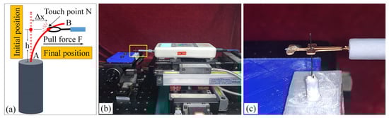 During the movement of the brush, it made close contact with the winding surface and compressed the surface. The contact part produces elastic force due to deformation. The greater the elastic force, the stronger the ability to pull the wire. However, flexibility needed to be considered in this process. This section estimates, by means of an experiment, the contact elastic force of the horizontal brush under bending deformation. Figure 8a gives the experimental principle. We fixed the brush unit on a base. The brush unit had both ends A and B, where point A was fixed and point B was suspended. We set the maximum length of the brush unit without deformation as H. We pulled the brush unit at the length h (h < H) using a dynamometer. Its contact point was N, the direction of tension F was in the horizontal direction, and the horizontal movement distance of contact N was Δx. We measured the relationship between Δx and the pulling force F. Figure 8b shows the established experimental system; the dynamometer was a high-precision digital push-pull meter with a range of 0–5 N, an accuracy of 1% of the measured value, and a sampling rate of up to 1000 times/s. The dynamometer was fixed on a set of the two-dimensional translation stage (with a grating ruler, the repeat positioning accuracy was 1 μm), which could move along the X-axis or Y-axis direction to adjust the position of the dynamometer. Figure 8c shows a partial enlargement of the brush pulled by the dynamometer. The brush unit was fixed on the base, the initial state remained vertical, and contact with the dynamometer was achieved through a special fixture. In the process of force measurement, we controlled the two-dimensional translation stage to ensure even movement to the right; the moving distance Δx was provided by a grating ruler of the electrically controlled translation stage. The elastic contact force of the brush was approximately replaced by the pulling force F, which was measured and recorded by the dynamometer.