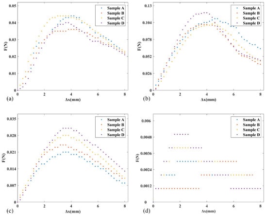 In the experiment, brushes were produced from brush units of nylon, bristle, nanometer silk and wool four materials. We produced four samples of each material and the length of all samples was H = 20 mm. In the experiment, the minimum value of h corresponding to the contact point N was 2 mm. When the translation stage driving dynamometer moved to the right, the value of Δx gradually increased and we set the maximum Δx value to 8 mm; then, we measured the force F at different Δx values and plotted the F-Δx scatter plot, as shown in Figure 9.