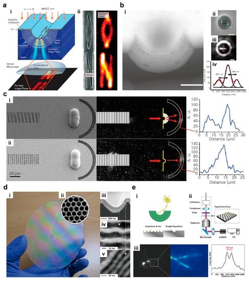 Hyperlens. (a) One-dimensional super-resolution imaging that uses a cylindrical hyperlens. (i) Schematic of cylindrical hyperlens and (ii) simulation result of subdiffraction-limited object. Reprinted with permission from ref. [], AAAS. (b) Two-dimensional super-resolution imaging using a spherical hyperlens. (i) A scanning electron microscope (SEM) image of the spherical hyperlens. Measured images of object having two 100 nm size dots and a 100 nm bar through (ii) SEM and (iii) hyperlens. All scale bars shown in (i)–(iii) are 500 nm. (iv) Cross-sectional analysis result of image by captured hyperlens. Reprinted with permission from ref. [], Springer Nature. (c) Non-resonant, broadband hyperlens. Experimental results of sample (i) with hyperlens and (ii) without hyperlens. Reprinted with permission from ref. [], Springer Nature. (d) A large-scale hyperlens fabricated by nanoimprinting. (i) Photograph, (ii) SEM and (iii)–(v) TEM images of hyperlens with different magnification. (e) A biomolecular imaging using a hyperlens array. (i) Concept of positioning samples on a hyperlens array and (ii) hyperlens implemented imaging setup. (iii) Captured neuron image. Reprinted with permission from ref. [], ACS.