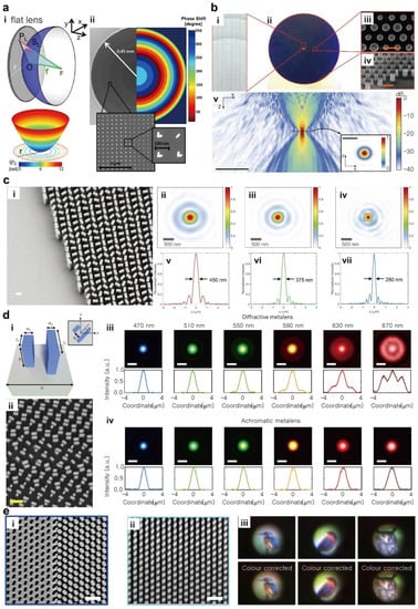 An achromatic metalens that operates at 470 ≤ λ ≤ 670 nm has been demonstrated by independently controlling the phase, group delay and group delay dispersion by using the design principle in Equation (2) (Figure 2d) []. Similarly, a broadband achromatic metalens operating over a half of the visible regime has been proposed by using a judiciously designed metalens (Figure 2e) []. The efforts towards the metalens beyond the monochromatic operation have been also made for several discrete wavelengths in the visible [,] or in the near-infrared []. The broad bandwidth has been also achieved by using plasmonic materials despite their strong material dispersion, by compensating for it by using structure dispersion of surface plasmon polaritons []. To tackle the series of phase derivatives, several numerical optimization and inverse design methods have been applied to design achromatic metalenses [,,].