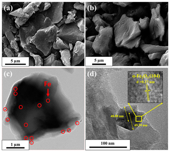 In addition to improving its electrical conductivity and the overall electrochemical properties, modifying AC with Fe2O3 nanoparticles can play a crucial role in improving the physicochemical characteristics of AC, thus achieving an efficient CDI electrode. SEM and TEM images of pristine AC and the AC/Fe2O3 nanocomposite are shown in Figure 1. Both AC and AC/Fe2O3 have micron-sized particles with rock-like shapes. The TEM images of the AC/Fe2O3 nanocomposite (Figure 1c,d and Figure S1a–d) show the homogeneous incorporation of Fe2O3 nanoparticles throughout the AC sheet, with an average particle size of ~55 nm. The inset image in Figure 1d describes the HRTEM of the produced nanoparticles, which show the regular arrangement of the atoms to form an atomic plane. The interplanar spacing is found around 0.27 nm, which is in fully consistent with the 104 plane of the main peak of Fe2O3 (Table S1).
