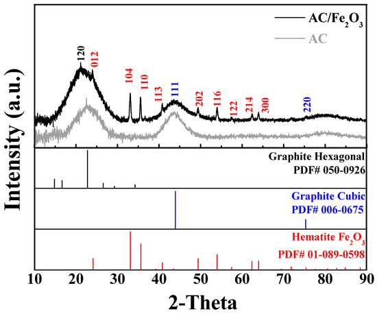 The XRD patterns of the AC and AC/Fe2O3 composite are presented in Figure 3. The XRD pattern for AC used as a reference material clearly shows the changes in the peaks when Fe2O3 was incorporated on its surface. AC exhibits an amorphous structure with two broad peaks at 2θ of approximately 22.7°, and 43.7° corresponding to the (120) planes of the graphite hexagonal structure and the (111) cubic structure, respectively. In the case of AC/Fe2O3, additional Bragg peaks of Fe2O3, the hematite phase, are clearly observed.