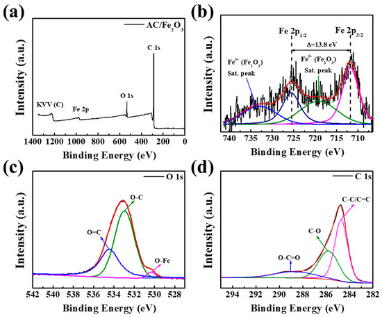 XPS analysis was performed to further characterize the surface structure of the modified AC/Fe2O3. Figure 4a shows a typical XPS survey spectrum for AC/Fe2O3. The XPS profile shows peaks of Fe 2p, O 1s, and C 1s; no other elemental peaks were detected, which reveals that the AC/Fe2O3 mainly included three elements: Fe, O, and C. In the fitted Fe 2p spectrum depicted in Figure 4b, there are two broad peaks at 711.78 and 725.48 eV, assigned to Fe 2p3/2 and Fe 2p1/2, respectively. The satellite peaks at 719.08 and 733.18 eV, which correspond to the main peaks of Fe 2p3/2 and Fe 2p1/2, respectively, were assigned to the Fe3+ in Fe2O3, which agrees well with previous reports [34,35]. The peak positions of the three parts divided in the O 1s XPS spectrum (Figure 4c) were 530.38 eV (Fe–O), 532.98 eV (O–C), and 534.48 eV (O=C), indicating that the Fe2O3 was incorporated efficiently on the AC surface based on the obtained chemical bonds. The C 1s XPS spectrum of AC/Fe2O3 in Figure 4d exhibits three major peaks with binding energies at 284.78, 285.88, and 289.28 eV, which are consistent with the C–C/C=C, C–O, and O–C=O configurations, respectively [36,37]. Furthermore, the interference of Fe metal was further confirmed by the atomic concentration (atomic weight %) presented in Table 2. In conclusion, the refined XPS spectral analysis results suggest the successful incorporation of Fe2O3 nanoparticles on the AC surface.