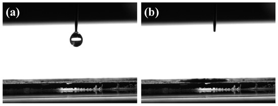 The wettability of AC and the AC/Fe2O3 nanocomposites was evaluated through water contact angle (WCA) experiments. Photographic images of the water drops on the material surfaces are shown in Figure 5 and Figure S3. According to the literature, the wettability of the surface is associated with the hydrophobic/hydrophilic properties of the utilized material and its components [38]. The WCA value of AC was 86.8° (Figure S3). The WCA dramatically decreased when Fe2O3 species were incorporated into AC, below 3°, as depicted in Figure 5a,b. The enhanced wettability revealed the successful incorporation of Fe2O3 nanoparticles on the AC particles, as inferred from the abovementioned XPS analysis. It is predicted that the increased surface free energy would enhance ion diffusion within the nanocomposite structure during the desalination process [39,40]. For comparison, Trinh et al. [31] investigated the wettability of Fe3O4 nanoparticles intercalated in reduced graphene oxide (rGO). The hydrophilicity of this carbon-based material was improved after the modification of the rGO with Fe3O4 nanoparticles in different ratios (Fe3O4/rGO): 0:1 (51.7°, bare rGO), 1:8 (49.5°), 1:4 (26.1°), and 1:2 (34.8°). This indicates the successful incorporation of Fe2O3 on AC by the hydrothermal method in our study.