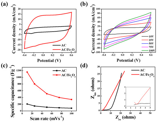 CV curves (a) for the proposed electrodes and (b) for the AC/Fe2O3 electrode at various sweep rates. (c) Specific capacitance for the electrodes and (d) Nyquist plot for the electrodes in a 1 M NaCl aqueous solution.