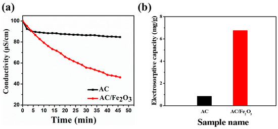 The desalination performances of AC and AC/Fe2O3 electrodes at 1.2 V were tested in a NaCl solution (~100 μs cm−1). As shown in Figure 7a, once the voltage was applied to the CDI cell, the ions in the salt solution migrated to the oppositely charged electrodes and were absorbed into the pores of the active electrode material, resulting in a dramatic decrease in the conductivity. Clearly, the AC/Fe2O3 nanocomposite showed a significantly higher ion adsorption capacity than the AC electrode. The CDI cell with the AC/Fe2O3 electrode achieved a high salt removal efficiency (η) of 53.68%. The CDI with the AC electrode exhibited a salt removal efficiency of only 15.29%. The electrosorptive capacities were calculated to be 0.85 mg g−1 for the AC electrode and 6.76 mg g−1 for the AC/Fe2O3 electrode (Figure 7b). Moreover, the average salt absorption rate was calculated to be 0.018 mg g−1 min−1 for the AC electrode and 0.14 mg g−1 min−1 for the AC/Fe2O3 electrode. Figure S4 depicts the regeneration profiles for the AC/Fe2O3 electrode. The introduced AC/Fe2O3 can be regenerated completely and easily, which ensures a cost-effective and low energy future for the CDI process. Notably, the AC/Fe2O3 nanocomposite electrode showed a higher electrosorption capacity than previously reported relevant electrodes, as shown in Table 3. This remarkable performance obtained for the AC/Fe2O3 electrode is ascribed to the enhanced wettability after the incorporation of AC with Fe2O3 nanoparticles, which might facilitate ion adsorption based on the full contact between the AC/Fe2O3 electrode and the salt solution. Additionally, its high specific surface area effectively produced more sites for an optimum adsorption of a large number of ions. The outstanding electrical conductivity of the AC/Fe2O3 nanocomposite is also a crucial parameter for achieving high capacitance.