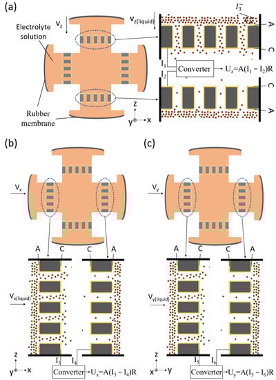 Figure 2a shows the working principle of the z-axis, where the brown dots represent triiodide ions. In response to the vibration along the z direction, the plexiglass shell and sensitive electrode vibrate with the ground, while the electrolyte solution flows relative to the sensitive electrode due to inertia. Thus, the external vibration is converted into the flow of the electrolyte solution relative to the sensitive electrode.