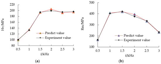 Comparison between the experimental and predicted values with different frequencies. (a) Microhardness and (b) tensile strength.