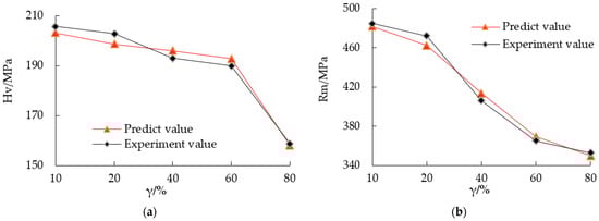 Comparison between the experimental and predicted values with different duty cycles. (a) Microhardness and (b) tensile strength.