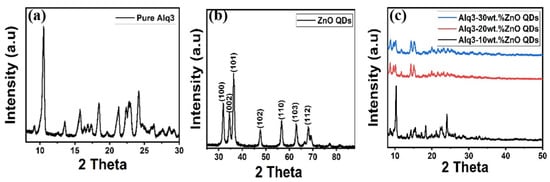 To synthesize Alq3-10 wt.% ZnO QDs, Alq3 (180 mg) was suspended in ethanol (32.5 mL) with stirring. ZnO QDs (20 mg) were also suspended in ethanol (3.25 mL) and sonicated. After 15 min, both suspensions were added with stirring and heated to 60 °C for 4 hrs. A precipitate was formed upon cooling which was collected by centrifugation and decantation, washed with ethanol, deionized water and dried under vacuum at 100 °C for 12 h. Identical procedures were used for the synthesis of Alq3-20 wt.% ZnO QD and Alq3-30 wt.% ZnO QD. For characterization, the MPD (Panalytical, Malvern, United Kingdom) Xpert Multipurpose X-ray Diffraction System was used for powder X-ray diffraction (XRD) analysis. A Spectrum 100 spectrometer (Perkin-Elmer, Waltham, Massachusetts, United States) and a Cary 5000 UV-vis-NIR spectrophotometer (Agilent Technologies, Santa Clara, California, United States) were used to record the Fourier transform infrared (FTIR) and absorption spectra, respectively.