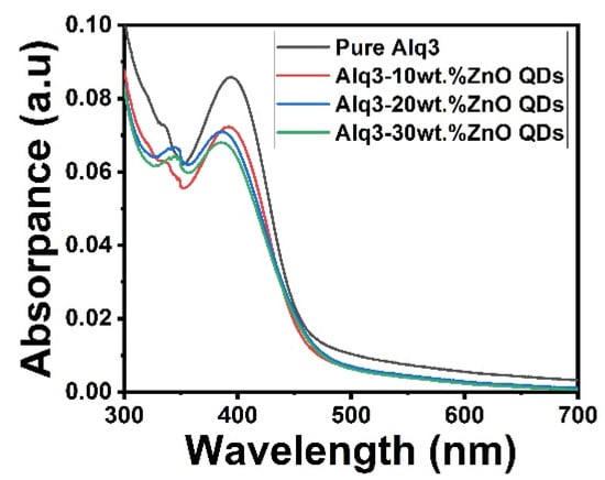 where n is 1/2 for allowed direct transitions, and 2 for allowed indirect transitions []. The direct band gap was estimated to be 2.79 eV for Alq3, which is consistent with the previously reported value []. The addition of ZnO QDs to Alq3 results in a slight decrease in the band gap with increasing concentration. The calculated bandgap energies of the Alq3-ZnO nanocomposites were calculated to be 2.76, 2.73, and 2.72 eV for Alq3-10 wt.% ZnO QDs, Alq3-20 wt.% ZnO QDs, and Alq3-10 wt.% ZnO QDs, respectively (Figure 4).