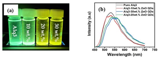 The only drawback to Alq3 complexes is their high environmental sensitivity and ease of photooxidation, which results in low stability and hence luminescence efficiency degradation, subsequently limiting their use in OLED devices []. Many researchers have proposed the use of hybrid (organometallic/inorganic) composites to overcome these issues. Besides, those hybrids showed significant improvements in mechanical strength, thermal stability, luminescent efficiency, and charge mobility when compared to pure Alq3 [,]. Cuba et al. [] showed that Alq3-ZnO composites exhibited enhanced luminescence properties and a slight shift from green emission to greenish blue. Li et al. []. reported that Alq3-nano-TiO2 using 8-vinyl POSS as a modifier resulted in an enhancement in the photoluminescence (PL) and electroluminescence (EL) properties of the composites. In this study, we report the yellow emission of Alq3 upon the introduction of ZnO quantum dots (QDs) as a dopant and studied the effect of ZnO QDs concentration on the structural and optical properties of the samples. Alq3-ZnO nanohybrids were synthesized using varying concentrations of ZnO QDs (10, 20, and 30 wt.%).