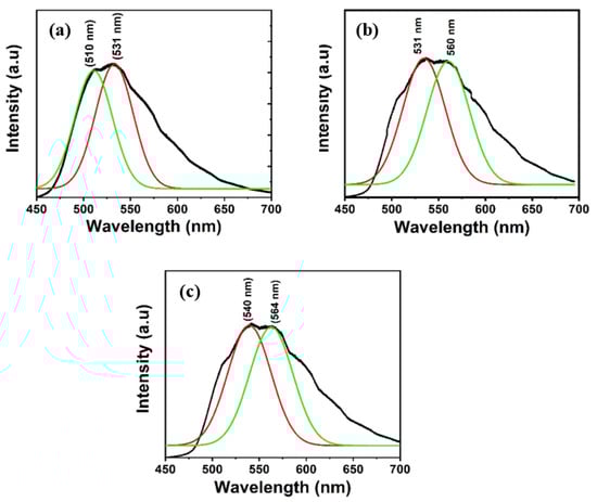 Deconvolution of the emission spectra of Alq3-ZnO nanohybrids. (a) Alq3-10 wt.% ZnO QDs (b) Alq3-20 wt.% ZnO QDs (c) Alq3-30 wt.% ZnO QDs.