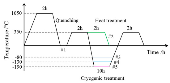 Heat treatment of specimens was carried out in a muffle furnace (Nabertherm, Germany, model LT15/11/B410), the time for the sample to rise to 350 °C was set to 30 min, and cooling was conducted with the furnace. Cryogenic treatment was carried out in a cryogenic furnace (Shanli Company, model SL500) with liquid nitrogen as the medium, the cooling rate of the sample was 4 °C/min, and heating was conducted with the furnace. The processing parameters for different aging treatments are listed in Table 2 and Figure 1. Cryogenic compound high-temperature aging treatment for different parameters is referred to as cryogenic treatment in this paper.