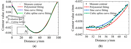 (3) Data processing. The measured contour values of the two cutting surfaces were averaged and fitted to eliminate errors. Polynomial, sine, and cubic spline curves were applied for fitting. The fitting errors of the above three methods were compared and analyzed with the original data. As shown in Figure 4a, the midline of the specimen section was taken along the length direction as the evaluation line. The squared variances of polynomial fitting, sine curve fitting, and cubic spline curve fitting were 0.00158759, 0.00568631, and 0.000183585, respectively. Figure 4b shows the zoomed area in A of Figure 4a, from which it can be found that the curve from the cubic spline interpolation function had a better fit to the original measurement data. Therefore, the cubic spline interpolation function was chosen to fit the cutting surface contour.