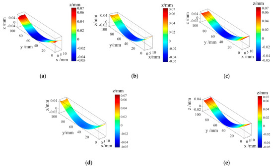 Figure 5 shows the contours of specimens #1 to #5 after cubic spline function fitting. The contour distribution of untreated specimen #1 was concave in the middle and convex on both sides, and the range of the contour amplitude was −0.05–0.07 mm. There was no obvious change in contour distribution characteristics of specimen #2 after the heat treatment and specimens #3 to #5 after the cryogenic treatment, whereas the contour amplitude decreased. The contour amplitude of specimens that underwent cryogenic treatment at 350 °C for 2 h, 130 °C for 10 h, and 350 °C for 2 h decreased to −0.02–0.04 mm.