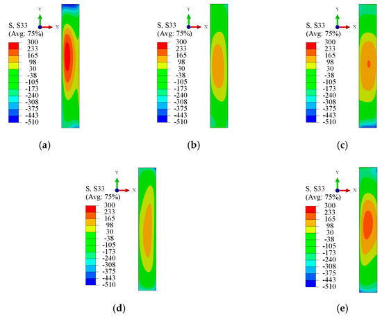 Stress reconstruction on cutting surface of specimens for different cryogenic parameters. (a) Specimen #1. (b) Specimen #2. (c) Specimen #3. (d) Specimen #4. (e) Specimen #5.