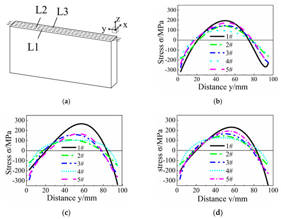 Three evaluation lines at the 25%, 50%, and 75% positions along the X-direction from the cutting surface were selected to compare the stress changes in specimens from each group. A schematic of the evaluation lines is shown in Figure 7a. The residual stress distribution on the three evaluation lines is shown in Figure 7. The stress distribution characteristics on L1, L2, and L3 remained unchanged, and they all showed a compressive stress on both sides and a tensile stress on the core. From Figure 7c, we can see that the maximum tensile stresses from #1 to #5 are 300 MPa, 100 MPa, 200 MPa, 100 MPa, and 200 MPa, respectively. There was a large stress in specimen #1, and the residual stresses of the specimens decreased specifically after heat and cryogenic treatment, in which the heat treatment at 350°C for 4 h and cryogenic treatment at 350 °C for 2 h, −130 °C for 10 h, and 350 °C for 2 h had a better effect on stress reduction. For the analysis of L2, the stress amplitude of specimen #1 was −350–270 MPa, and the stress amplitudes were −150–100 MPa after heat treatment at 350 °C for 4 h and cryogenic treatment at 350 °C for 2 h, −130 °C for 10 h, and 350 °C for 2 h, but the stress gradient was smaller in the core of the latter. For the L1 and L3 lines, the stress amplitudes were −300–200 MPa, −200–130 MPa, and −150–100 MPa, and the treatment conditions were untreated, heat treatment at 350 °C for 4 h, and cryogenic treatment at 350 °C for 2 h, −130 °C for 10 h, and 350 °C for 2 h, respectively. Single heat treatment and cryogenic treatment can reduce the internal residual stress, and the deduction in residual stress in the core of the specimen was more obvious according to line L2. In this test, the parameters of 350 °C for 2 h, −130 °C for 10 h, and 350 °C for 2 h showed the optimal stress relief effect among the four groups, and the stress amplitude decreased from −350–270 to −150–100 MPa.