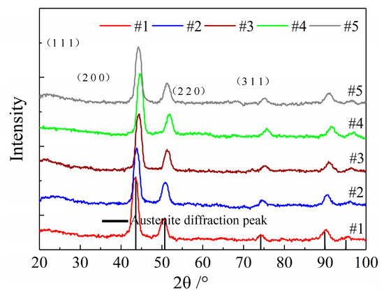 The diffraction peaks from the treated specimen XRD patterns were well indexed without extra diffraction peaks for other phases and matched with the austenite diffraction peak pattern, which indicates that the hydrogen-resistant steel material was single-phase austenite, and the austenite crystal planes were (1 1 1), (2 0 0), (2 2 0), and (3 1 1), as shown in Figure 8. Therefore, it was concluded that the austenite phase of the hydrogen-resistant steel remained stable without phase transition after cryogenic treatment.