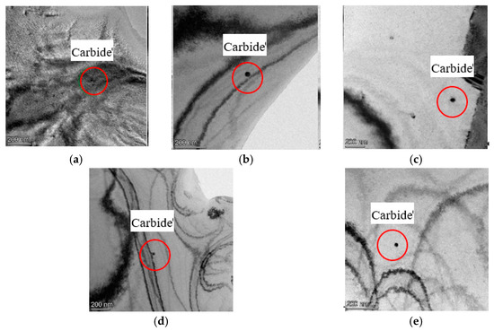 In this work, carbide precipitation of the specimens was observed by TEM to verify whether the reduction in residual stress by cryogenics was related to carbide precipitation. The result supports the conclusion that no phase transformation of the hydrogen-resistant steel specimens occurred after cryogenic treatment because the carbide precipitation was closely related to the phase transformation. Figure 9 shows the TEM microstructural morphology of the specimens. Particles with obvious contrast are precipitated carbides. For 1000 × 1000 nm, there was no obvious carbide precipitation in specimens after cryogenic treatment. Therefore, the carbide content of the hydrogen-resistant steel specimens after cryogenic treatment was stable.