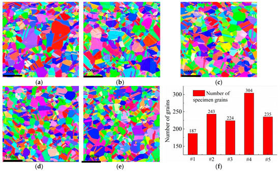 Figure 10 shows the microstructural morphology of hydrogen-resistant steel specimens for different cryogenic treatment parameters measured by EBSD. The grains of specimen #1 were coarse and unevenly distributed, and there were 187 specimen crystal grains. With the heating conditions and holding times, the coarse grains of specimen #2 were replaced by new and fine grains, with an increase in the number of crystal grains of 243. Compared with specimen #1, the number of crystal grains of specimen #2 increased by 29.9%. During cryogenic treatment, the grain size of specimens #3 to #5 was refined, with a change in cryogenic parameters. The number of specimen grains was 224, 235, and 304, which represented an increase of 19.8%, 62.6%, and 25.7%, respectively.