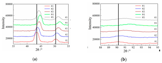 The diffraction peaks of the specimens for different cryogenic parameters. (a) 35°–55° diffraction peak distribution of specimens. (b) 88°–95°diffraction peak distribution of specimens.