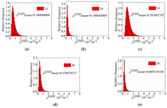 The ρGND must be selected to characterize the variation in dislocations, and the ρGND distribution that was calculated for the specimens treated with different cryogenic parameters is shown in Figure 12. The calculated results are as follows: #1: ρGNDmean = 0.100000006 × 1012/m2, #2: ρGNDmean = 0.140845069 × 1012/m2, #3: ρGNDmean = 0.103092792 × 1012/m2, #4: ρGNDmean = 0.129870127 × 1012/m2, #5: ρGNDmean = 0.069318184 × 1012/m2. Compared with untreated specimen #1, the average ρGND was 0.100000006 × 1012/m2, and the average ρGND of the specimens increased to 0.140845069 × 1012/m2 after heat treatment. After cryogenic treatment, the average ρGND of specimens #3 to #5 decreased to 0.103092792 × 1012/m2, 0.129870127 × 1012/m2, and 0.069318184 × 1012/m2, respectively, which indicates that the dislocation density increased during heat treatment and decreased during specimen nucleation in cryogenic treatment.