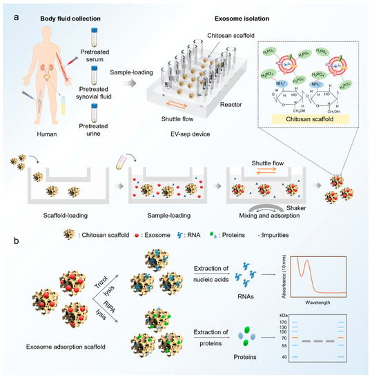 In this work, we developed a portable and simple device for circulating-exosome separation (EV-sep device) from biological samples. This device synergistically integrates chitosan electrostatic-adsorption [16], scaffold substrates, and shuttle flow to enable the highly effective capture of circulating exosomes. Using this device, exosomes can be isolated with a recovery rate of over 80% within 20 min, which is not accessible by ultracentrifugation (5–25%, 3 h). The capability of the device was also investigated using human serum, synovial fluid, and urine. This device allowed in situ exosomes lysis and further subjected to RNA and protein analysis. It may offer a promising platform for exosome clinical diagnosis and point-of-care testing.