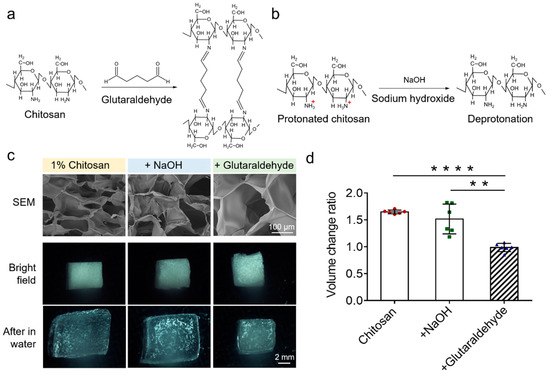 Selection of reaction system of the chitosan scaffold. (a) Chemical reaction equation of chitosan cross-linking by using glutaraldehyde. (b) Chemical reaction equation of chitosan cross-linking by using sodium hydroxide. (c) Scanning electron microscopy and optical microscopy images of chitosan scaffolds in different conditions, including without cross-linking, cross-linking by sodium hydroxide, and cross-linking by glutaraldehyde. The images of chitosan scaffolds after being soaked in water were also provided. (d) Volume change ratio of chitosan scaffolds before and after being soaked in water. The data were present as mean ± S.D. *** p < 0.0001 and * p < 0.005 by two-sided paired Student’s t test.