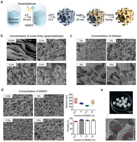 Optimization of the chitosan scaffold. (a) A general workflow was developed for the fabrication of the chitosan scaffold. (b) SEM images of chitosan scaffold fabricated with different concentrations of cross-linker glutaraldehyde. The concentration of chitosan was fixed at 2%. (c) SEM images of chitosan scaffold fabricated with different concentrations of chitosan. The concentration of glutaraldehyde was fixed at 0.3%. (d) SEM images, aperture, and porosity of chitosan scaffold fabricated with different concentrations of DMSO. The concentration of glutaraldehyde and the concentration of chitosan were fixed at 0.3% and 2%, respectively. (e) Photo and enlarged view of the optimized chitosan scaffold. Red arrows indicate the pores in the chitosan scaffold are connected to each other.