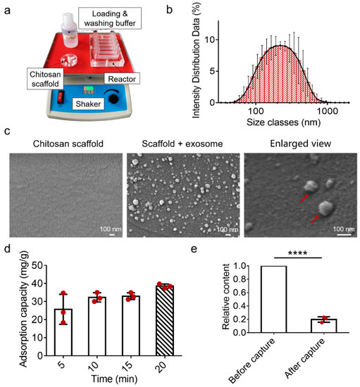 Characterization of the EV-sep device for exosome capture. (a) The device is composed of chitosan scaffolds, loading and washing buffer, a reactor, and a shaker, which provides shuttle flows. (b) Particle size analysis of standard exosome samples. (c) SEM images of chitosan scaffold before and after exosome capture. Red arrows show that particles with a size about 100nm and traditional exosome structure are absorbed on the surface of scaffolds. (d) Adsorption capacity of the chitosan scaffold for exosome capture. (e) The relative content of exosomes before and after adsorbed by the chitosan scaffold device. The data were present as mean ± S.D, n = 3. **** p < 0.0001 by two-sided paired Student’s t test.
