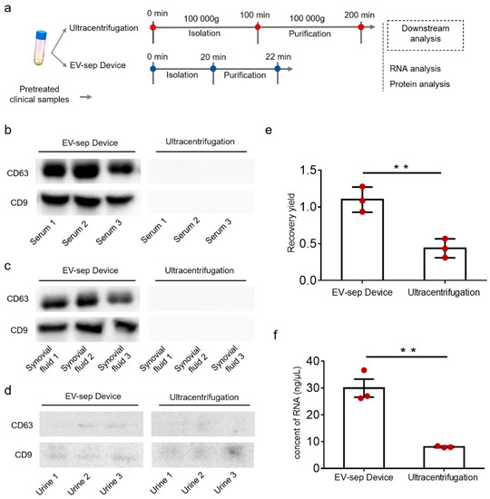In order to evaluate the performance of the EV-sep device, we used pretreated serum (1 mL), synovial fluid (1 mL), and urine (5 mL) to validate our method by comparing it with ultracentrifugation. The amount of chitosan we used for each sample was 0.005 g. The results were compared from three aspects, including operation time, protein extracted efficiency, and nucleic acid extracted rate.