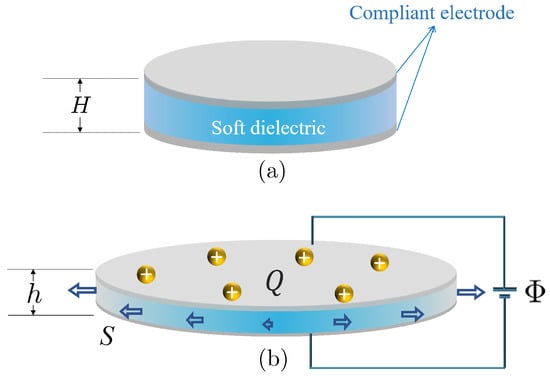 Consider a simple but commonly used device shown in Figure 1. The soft device consists of a circular dielectric film coated with compliant electrodes on its upper and bottom surfaces. By applying a voltage Φ in the thickness direction and a radial dead load S on the lateral surface, the soft film will expand its in-plane area and decrease its thickness due to the highly nonlinear electromechanical coupling, i.e., the film thickness will decrease from H to h and then its in-plane area increases because of the constraint of incompressibility. In addition, each compliant electrode gains an amount of electric charges Q during the electromechanical loading process. Therefore, we can simply consider the device shown in Figure 1 as a soft capacitor that can store a certain amount of mechanical and electric energy.