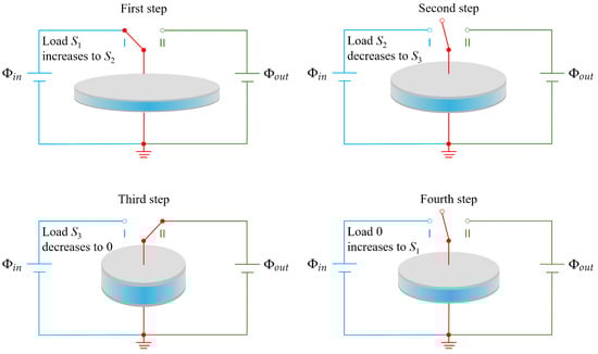 Let us look at the electric system shown in Figure 2. The soft dielectric film can be connected to either a power source with low voltage ( Φ i n ) or a power source with high voltage ( Φ o u t ) by using a switch. We will show how to pump electric charges from low voltage to high voltage. In the first step, the switch is switched on to I; meanwhile, we gradually increase the applied load S. During this process, the applied voltage on the film is constant ( Φ i n ), and the area of film increases; therefore, the dielectric film can carry more charges. In the second step, after the film gains a certain amount of charges ( Q i n ), we disconnect the switch, and the voltage on the film is equal to Φ i n at this moment. We then gradually decrease the applied load and the area of the film decreases, which makes the capacity of the soft capacitor decrease. Since the charges on the surface are isolated and there is a decrease in capacity, the voltage difference between the upper and bottom surfaces increases. In the third step, after the voltage increases to a threshold that is larger than the output voltage Φ o u t , we connect the switch to II, and then the charges proceed to power source II. In the fourth step, we disconnect the switch. The four stages form a cycle. With the input mechanical energy and the output electric energy, the soft device can be used as an energy harvester.