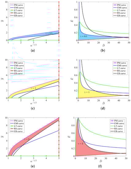 In contrast, we also show the effects of γ on the five curves in the E ¯ vs. D ¯ plane in Figure 4b,d,f. The governing equations of the five curves are given by (24). The change of the ratio γ has no effects on the PM curve (the origin), the RS curve and the EB curve. In other words, those three curves are independent of the value of γ on the E ¯ vs. D ¯ plane. In contrast, the EMI curve and the LT curve depend on the value of γ non-linearly.