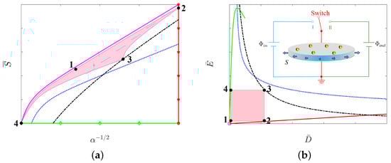 In the area enclosed by the five curves on the dimensionless electric field E ¯ vs. D ¯ plane, we plot a rectangle for which its four vertices are represented, respectively, by 1 , 2 , 3 and 4 in Figure 5b. The corresponding vertices on the dimensionless stress S ¯ vs. the stretch plane are shown in Figure 5a. Note that the vertices 2 , 3 and 4 are on the curves. Each side of the rectangle in Figure 5b represents a step of the process of energy harvesting. In particular, the four sides of the rectangle form a cycle of the energy harvesting by using the soft energy harvester. We also plot the soft energy harvester in the neighborhood of the rectangle to show how the energy harvester works in each step.