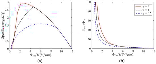 Figure 6a shows the specific energy (the area of the rectangle in Figure 5) generated per cycle of operation versus the input nominal electric field ( E ¯ on side 12 in Figure 5). Material parameters [10,25,32] used in the plots are chosen as E EB = 3 × 10 8 V / m , μ = 10 6 N · m 2 and ε = 3.54 × 10 11 F · m 1 , as well as the mass density ρ = 1000 kg · m 3 .