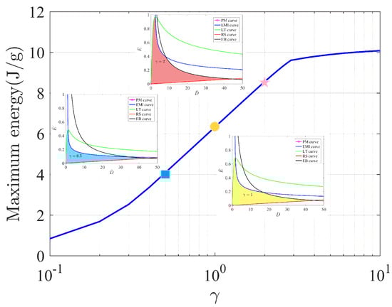 In Figure 4, we also note that the area enclosed by the five curve in the E ¯ vs. D ¯ plane changes with the increase in the ratio γ . It is known that the shaded area in the allowable state surrounded by various failure modes can be expressed as the maximal specific energy. It can be observed in Figure 4 that as the ratio γ increases, the shaded area increases, indicating that the maximum conversion energy increases. As mentioned in the work [32], four modes of failure result in a maximal specific energy of 6.3 J/g, corresponding to γ = 1 in Figure 4. Interestingly, the modes of failure admit a maximal specific energy that can be as high as 8.6 J/g at γ = 2 . Based on the discussion of Figure 4, we can increase the shadow area in the allowable state by changing the shear modulus of the material, thereby obtaining greater energy conversion efficiency.